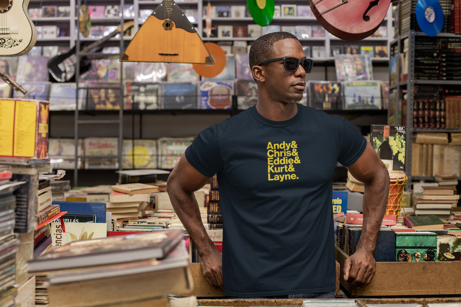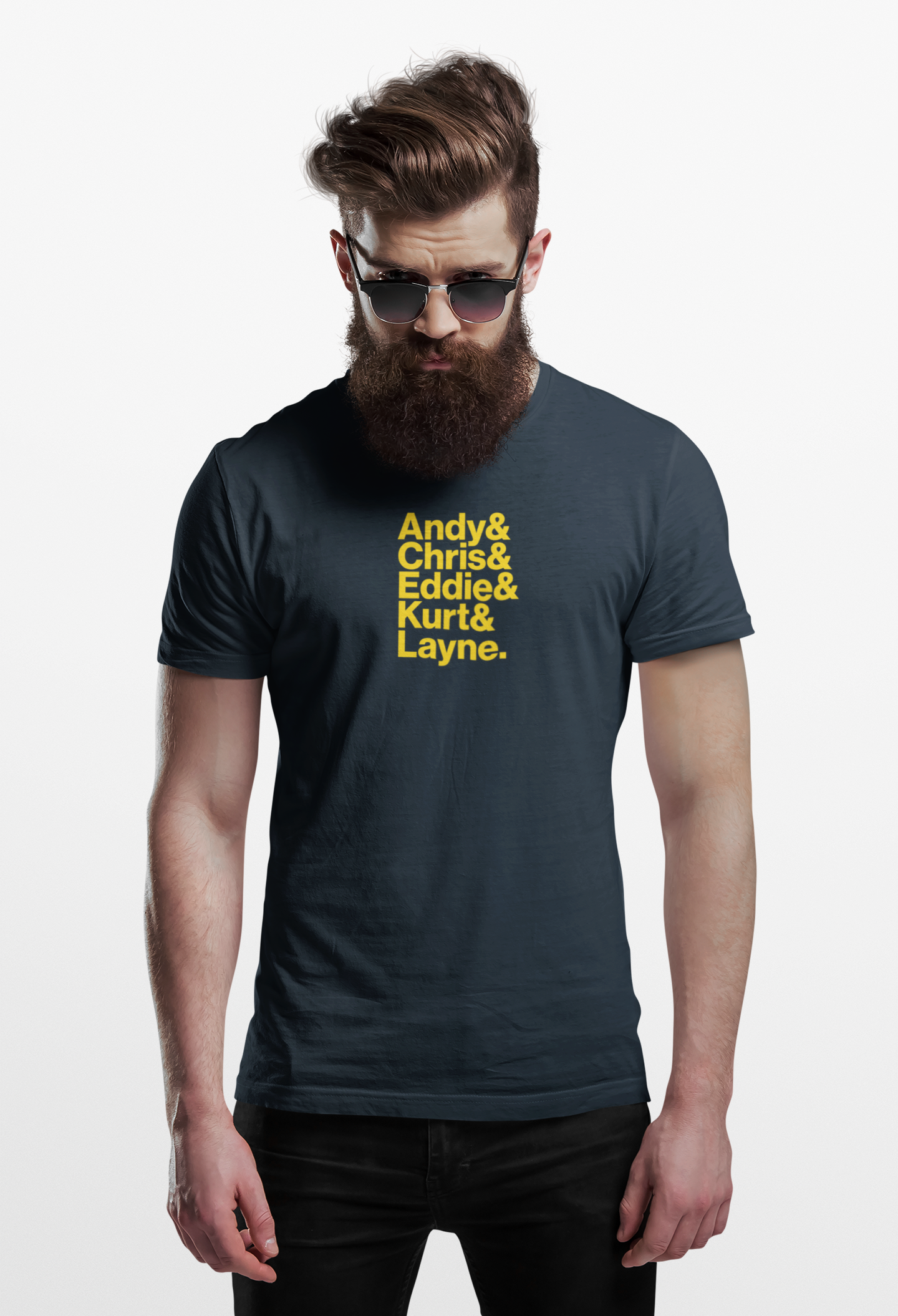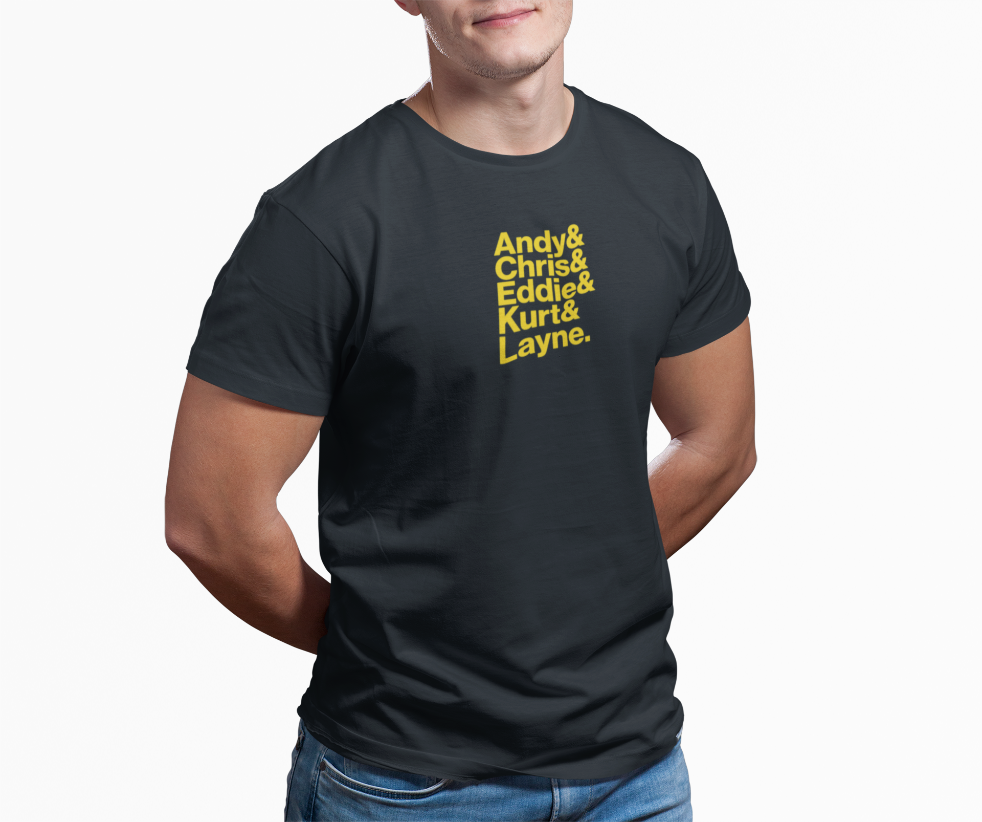 Celebra el legado de los íconos más influyentes del grunge y el rock alternativo con esta camiseta que destaca los nombres de Andy, Chris, Eddie, Kurt y Layne, los pilares de una era musical inolvidable. Este diseño elegante y minimalista rinde homenaje a las voces y espíritus que marcaron a una generación y dejaron una huella indeleble en la historia de la música.